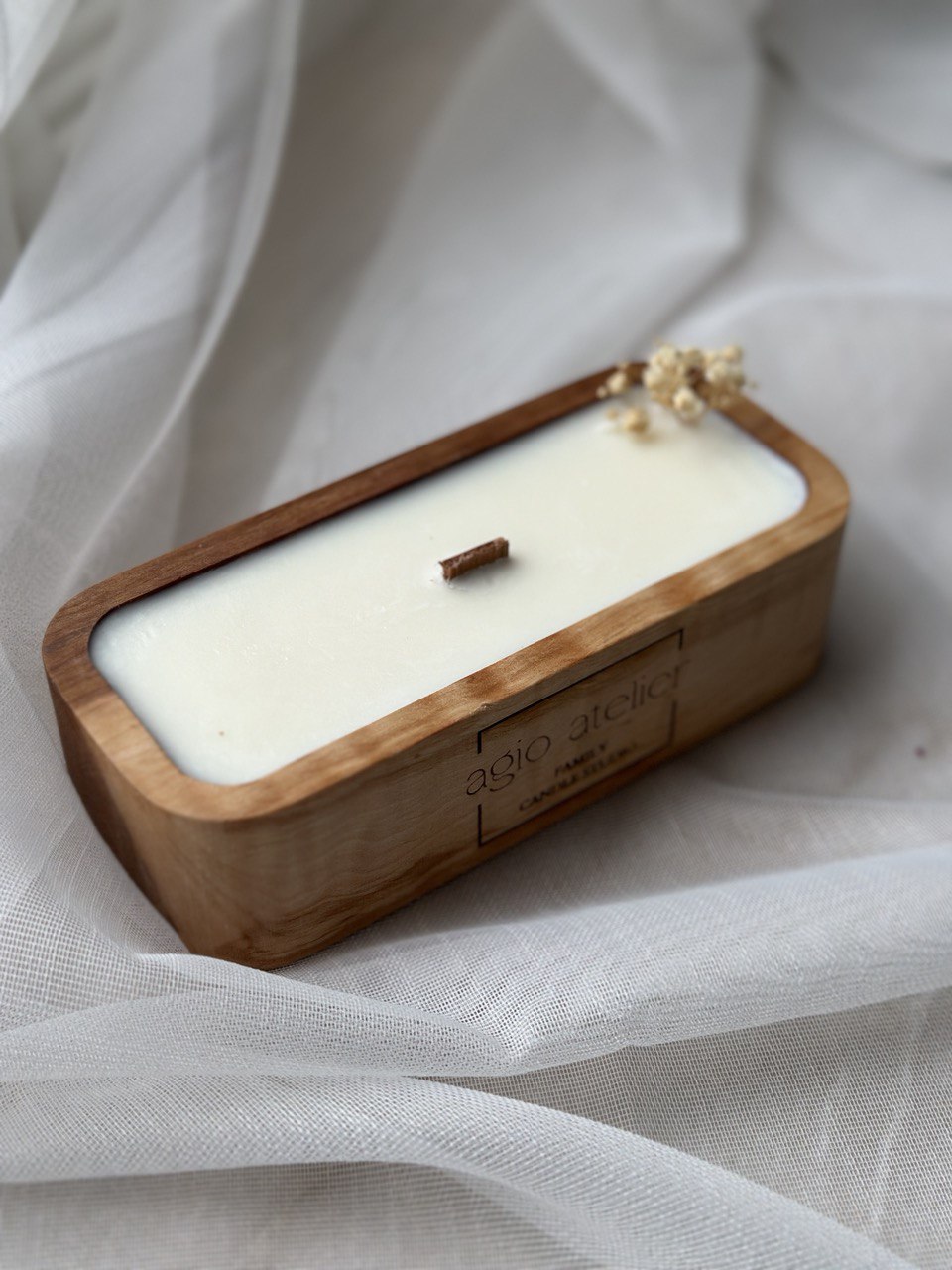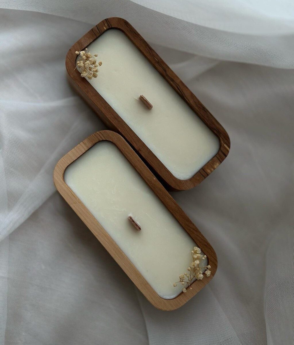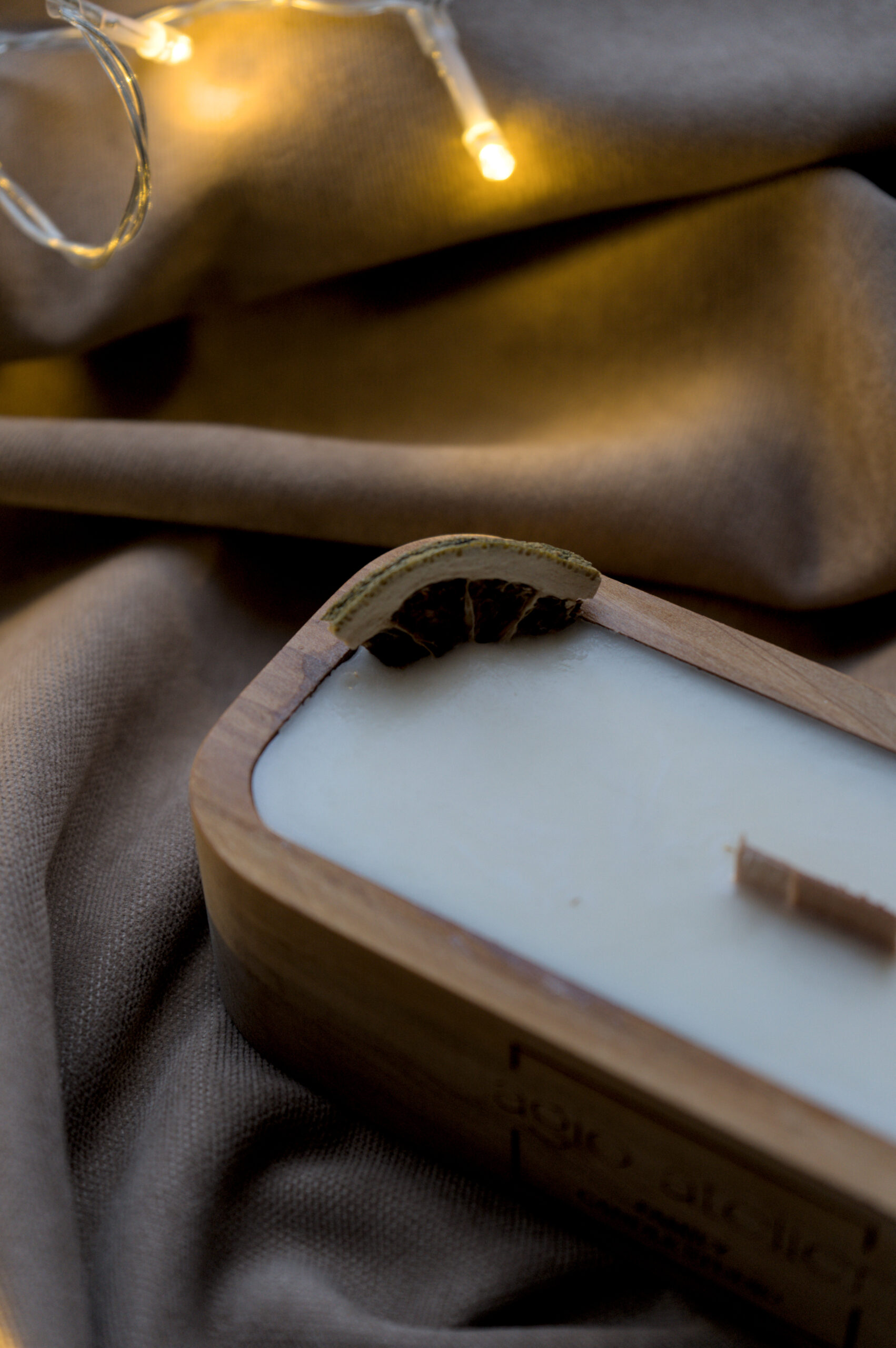 Kerze in Holzschale, natürlich verarbeitet, mit Gypsophila oder Weihnachtsdeko.