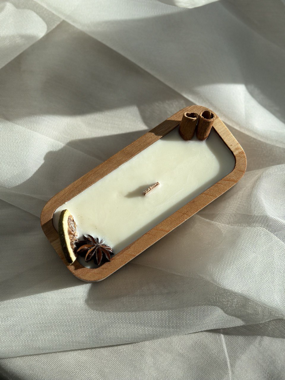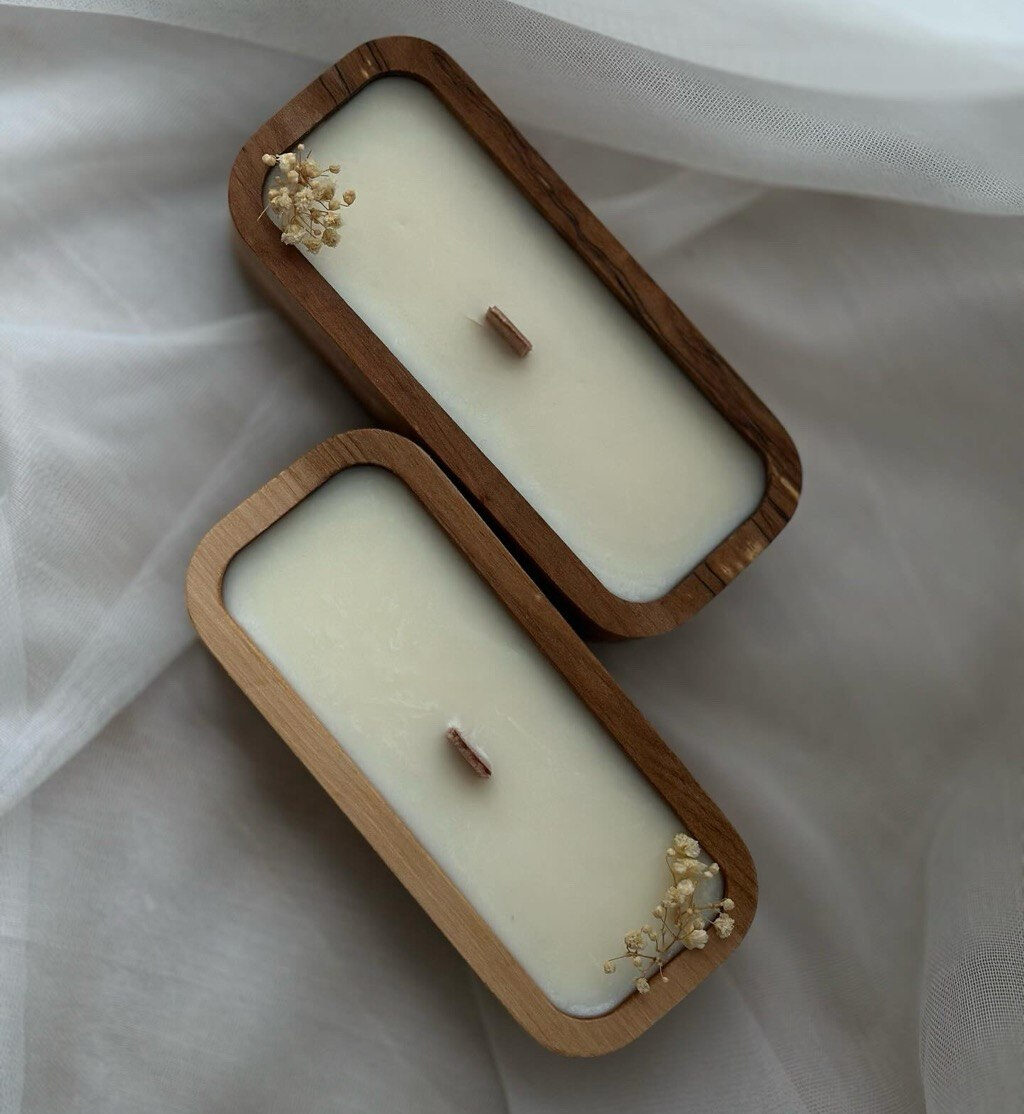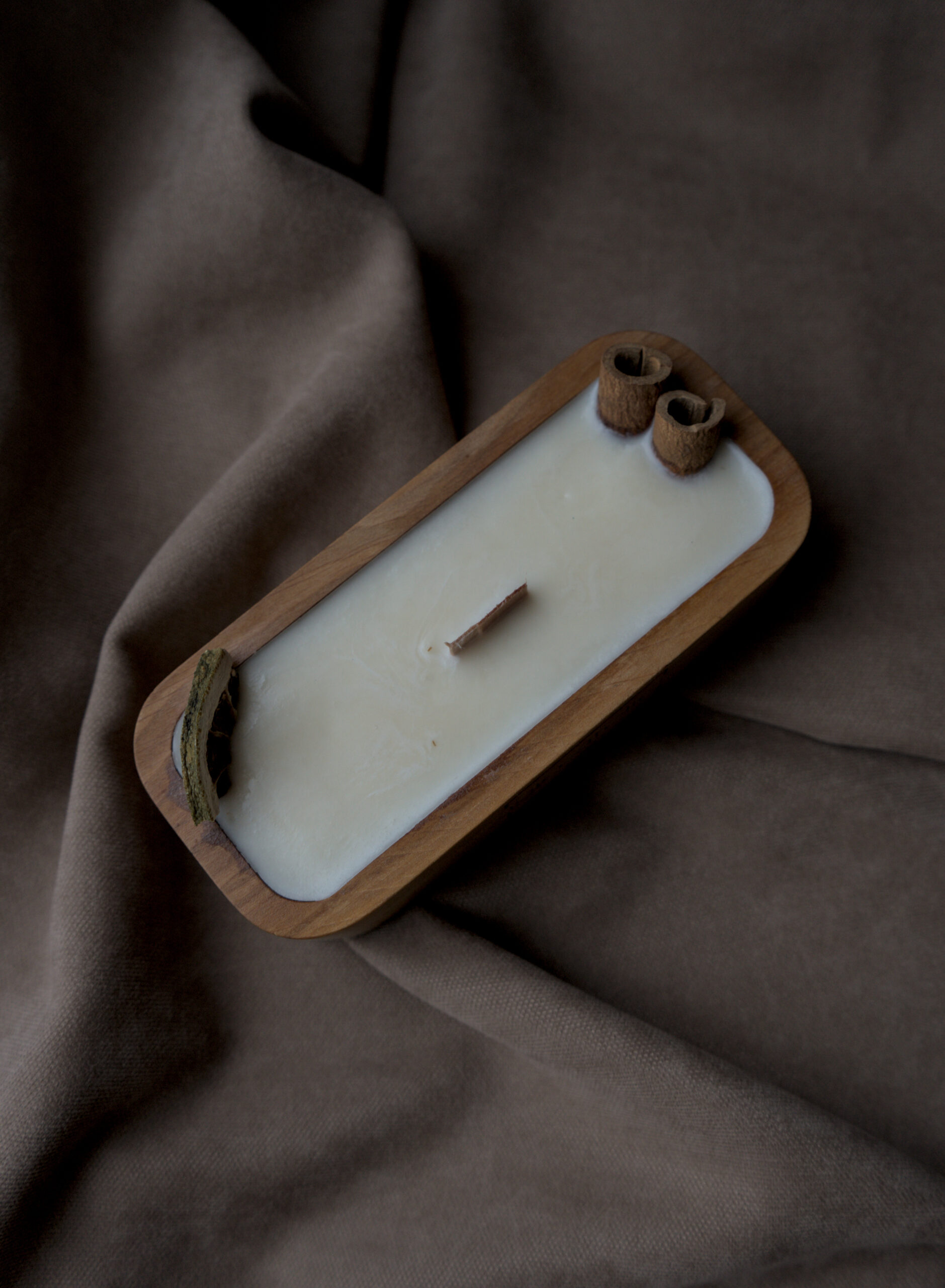 Kerze in Holzschale, natürlich verarbeitet, mit Gypsophila oder Weihnachtsdeko.