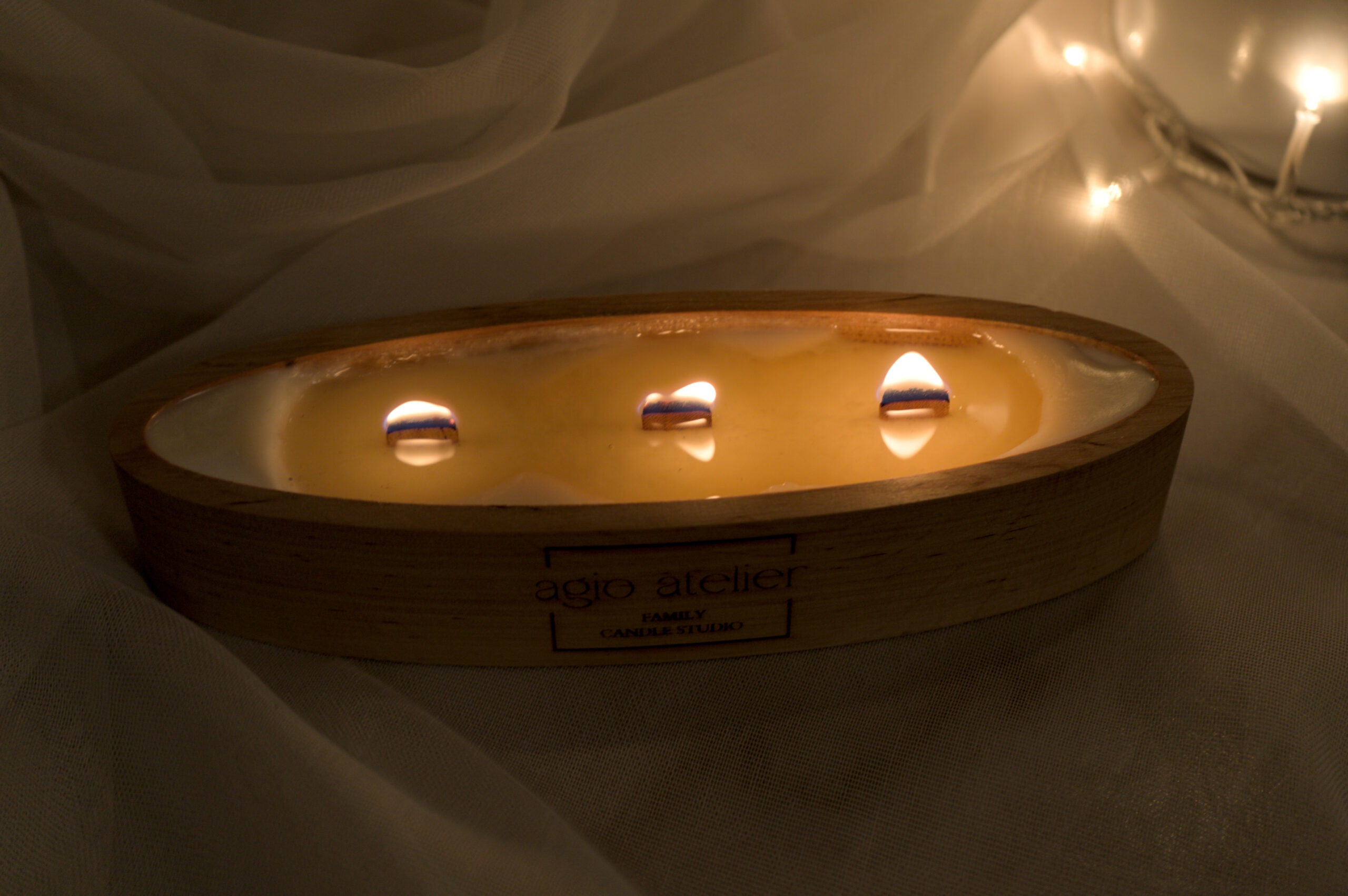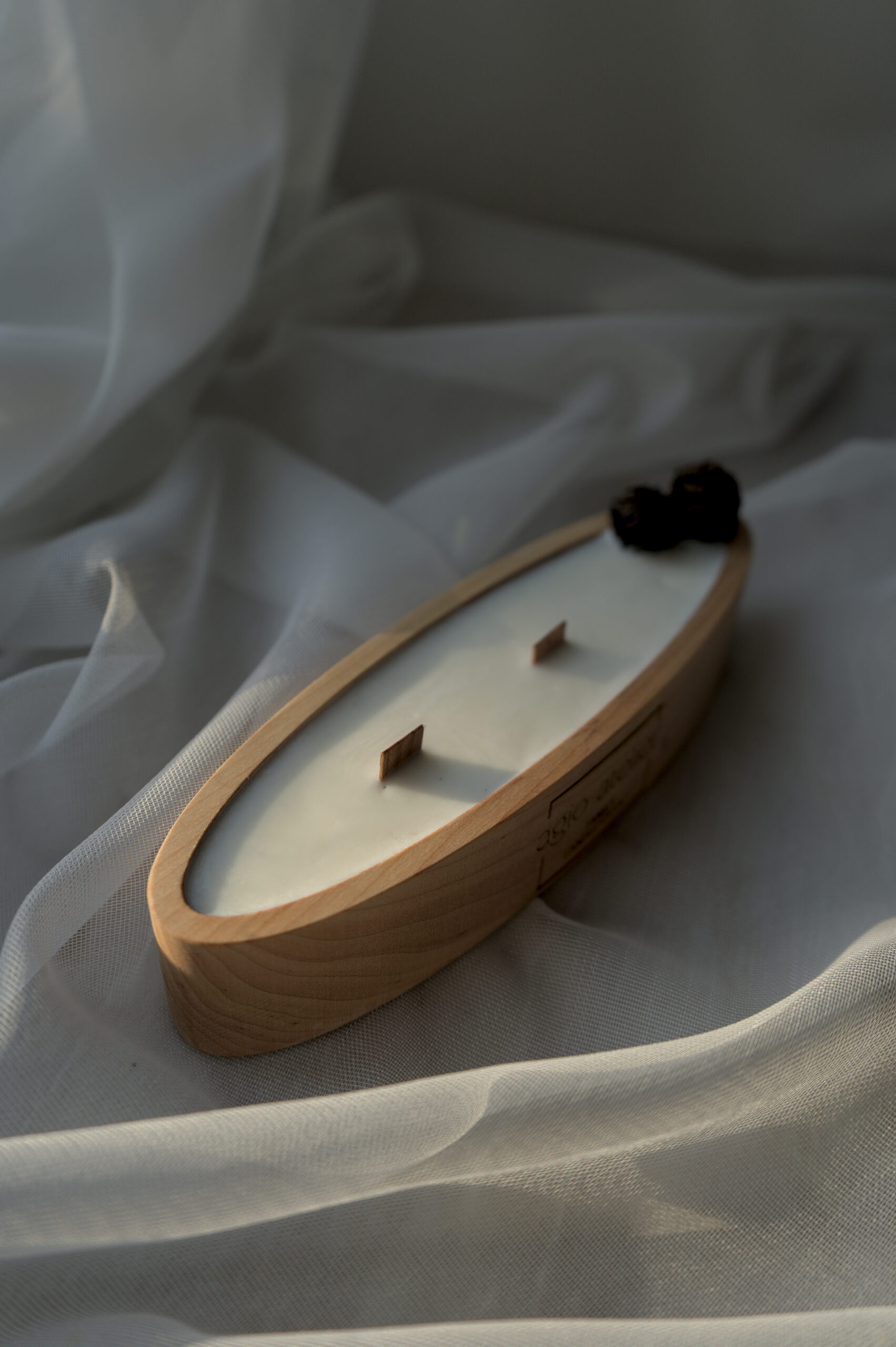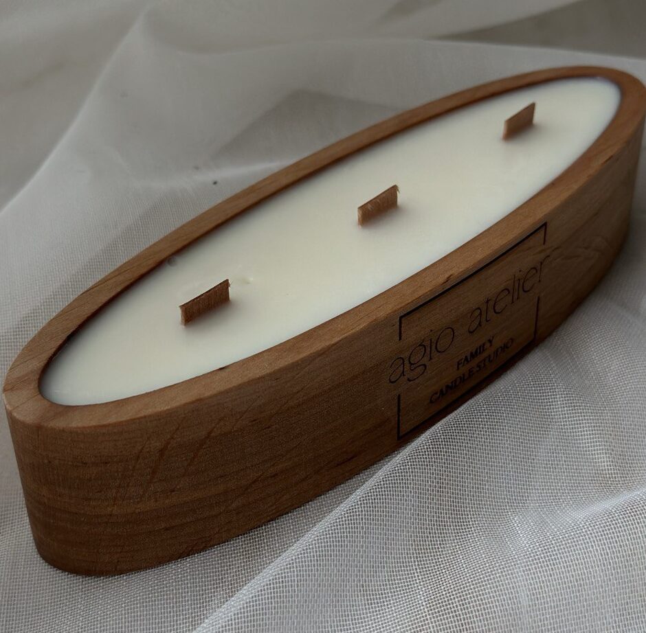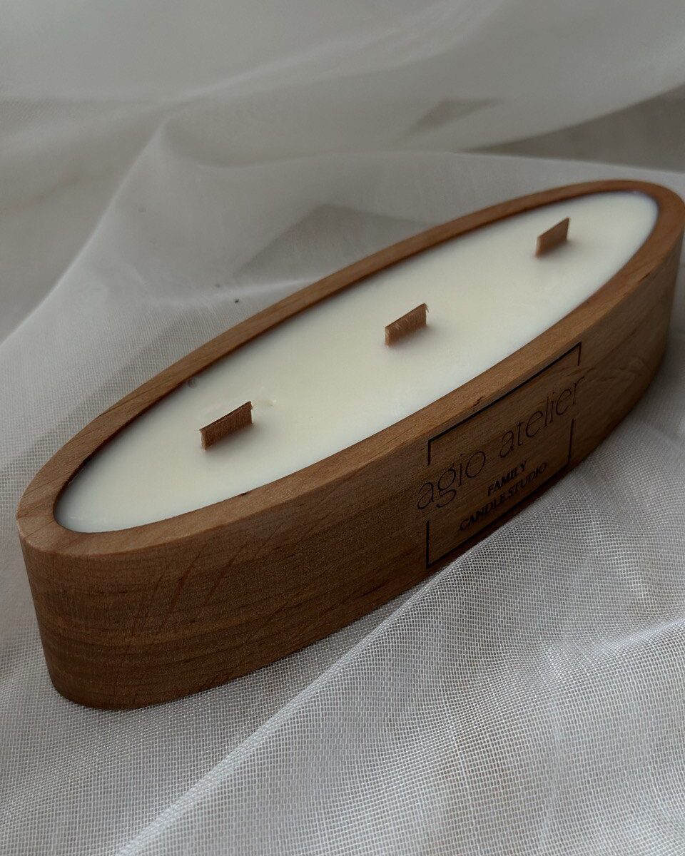 Lagoon ist eine elegante Kerze in einer natürlichen Holzschale mit sanft ovaler Form.