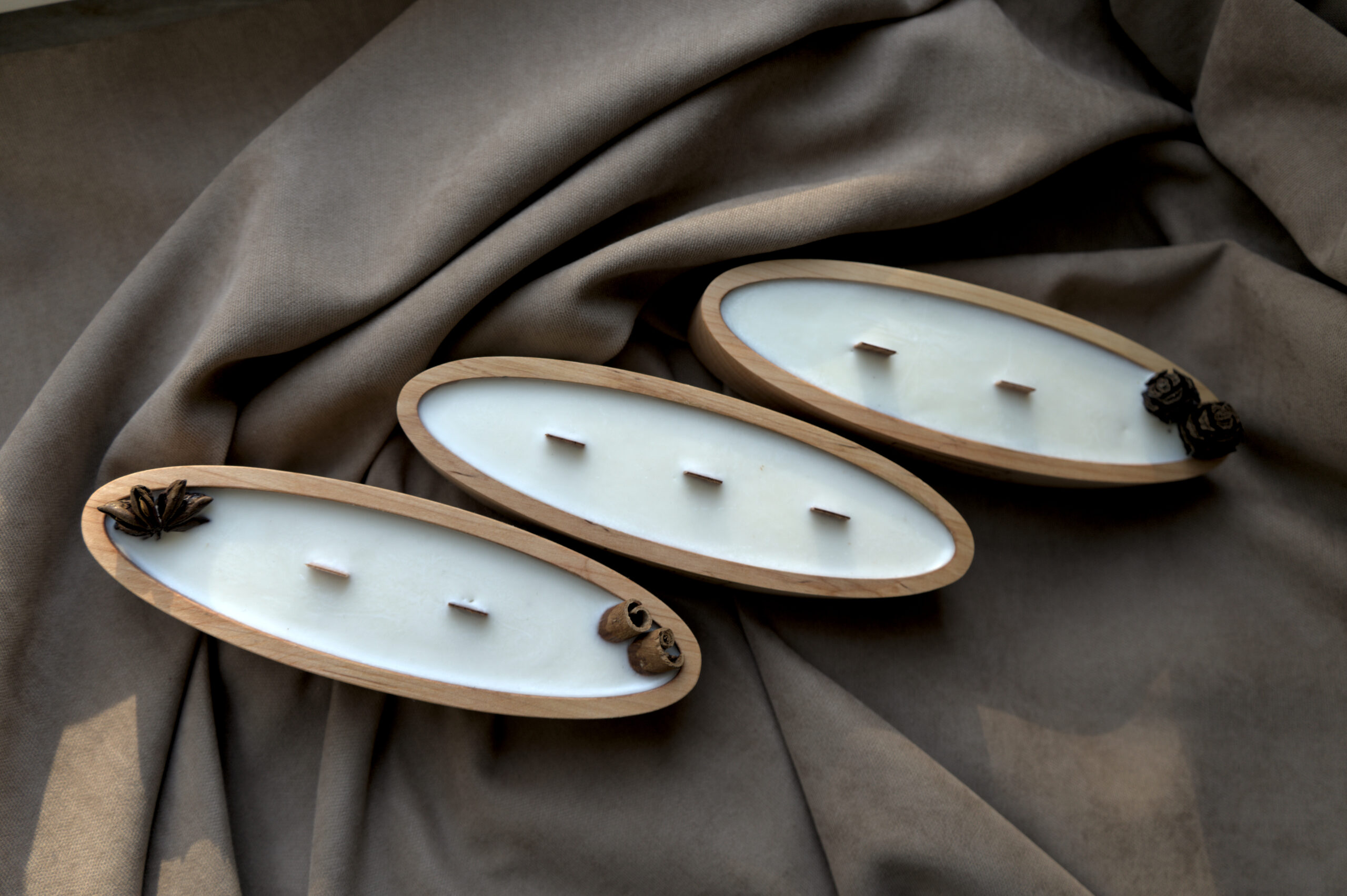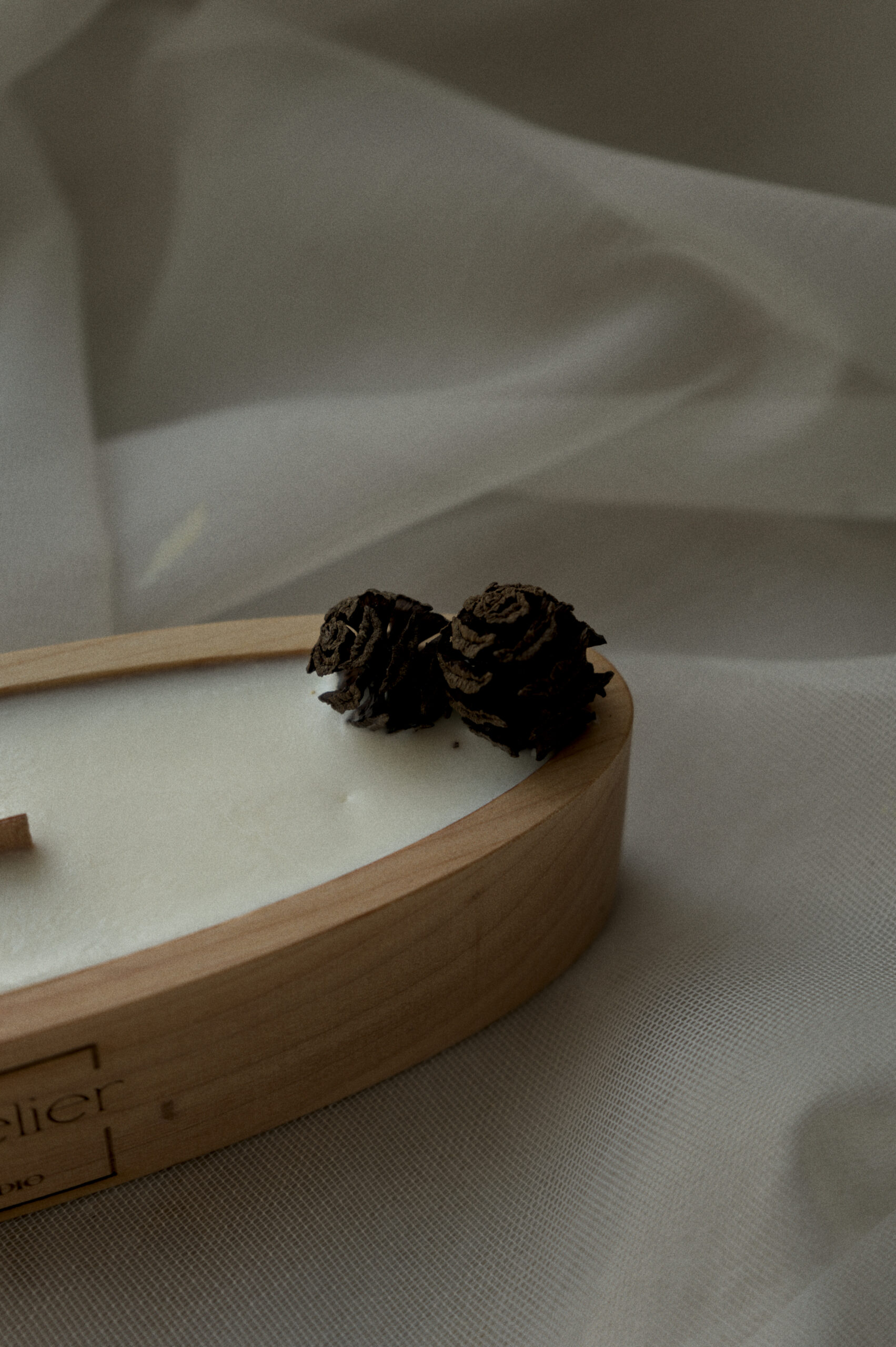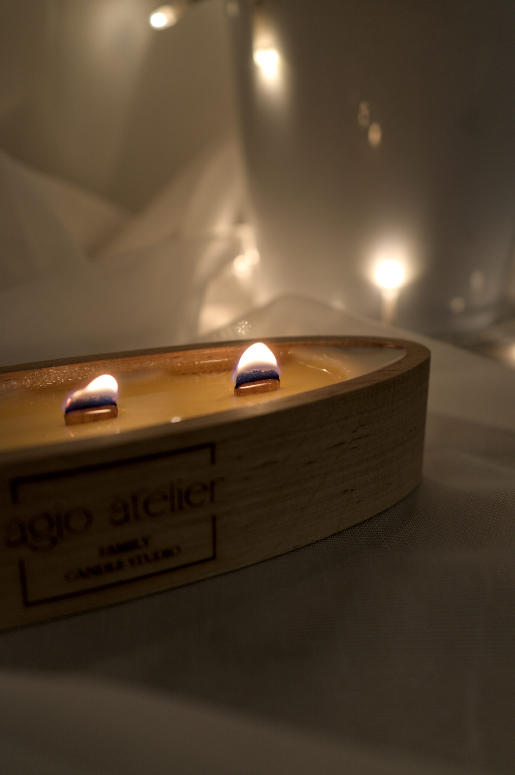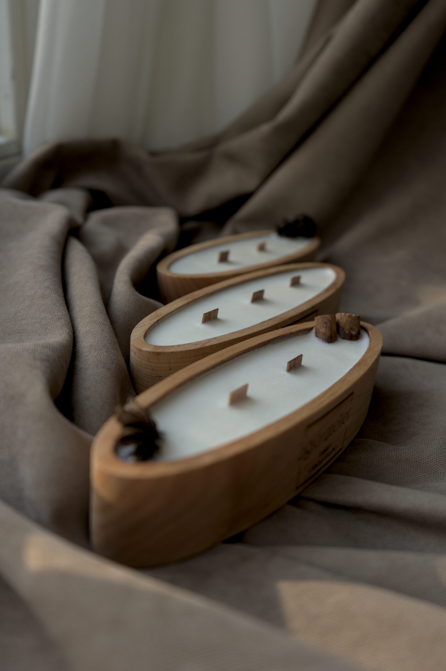 Lagoon ist eine elegante Kerze in einer natürlichen Holzschale mit sanft ovaler Form.