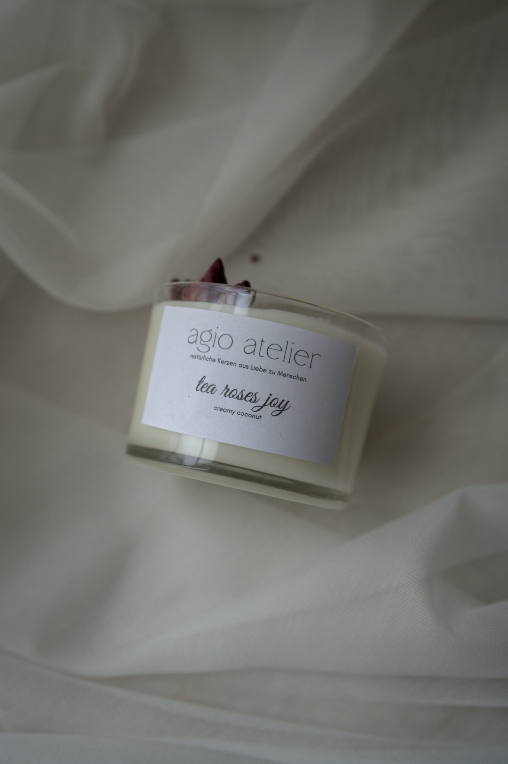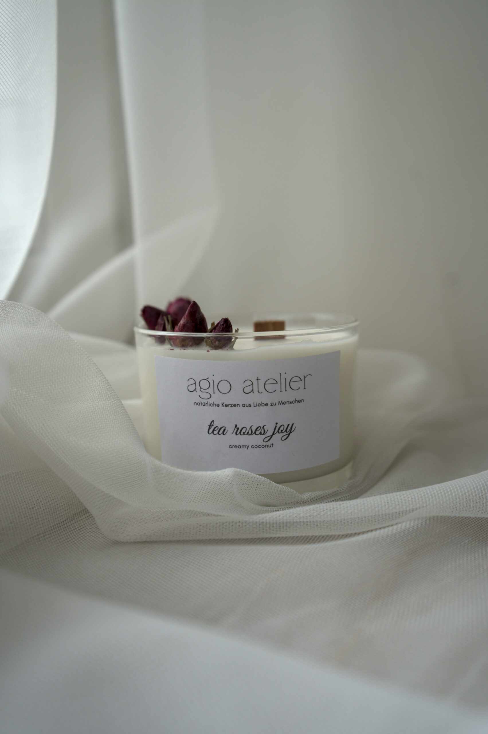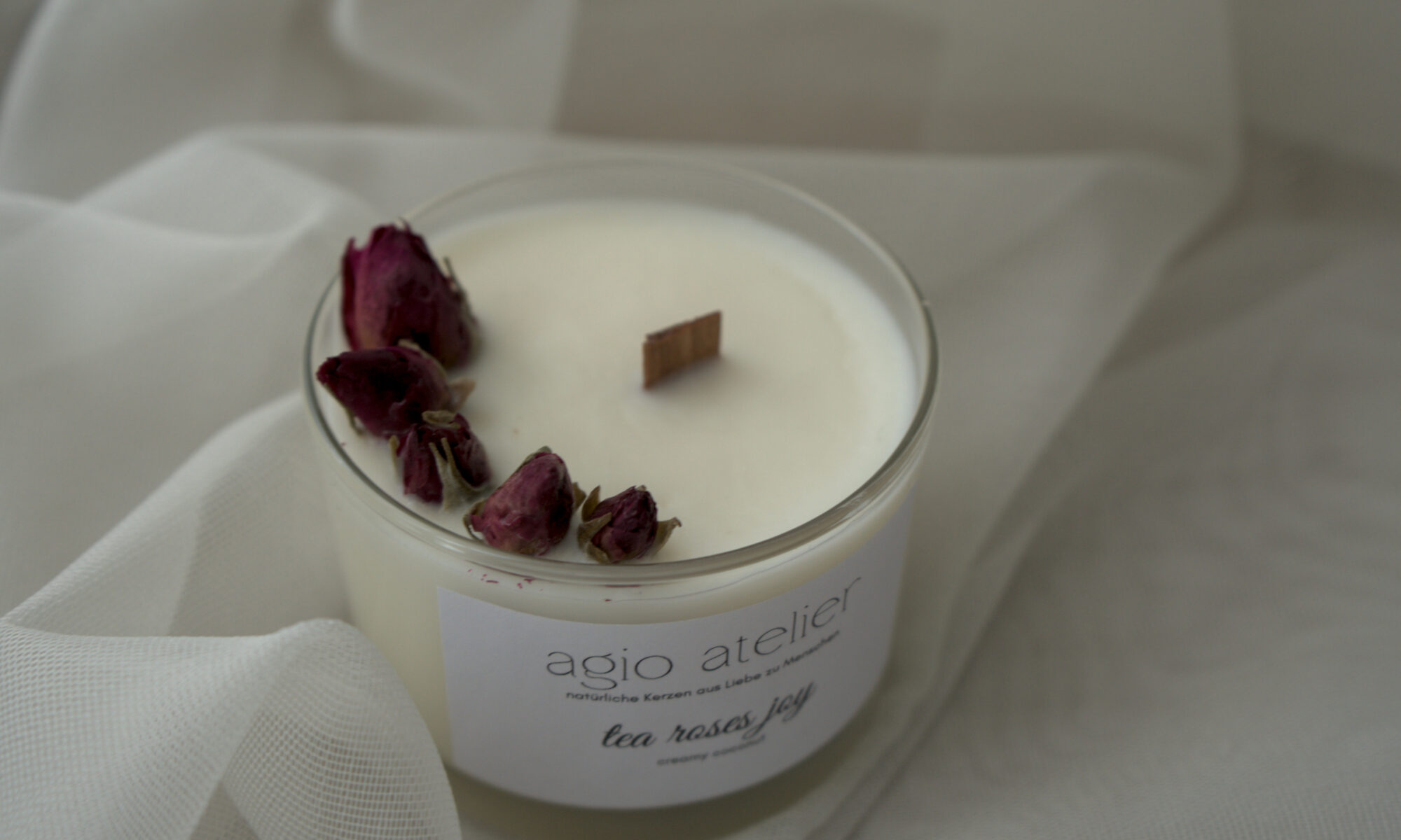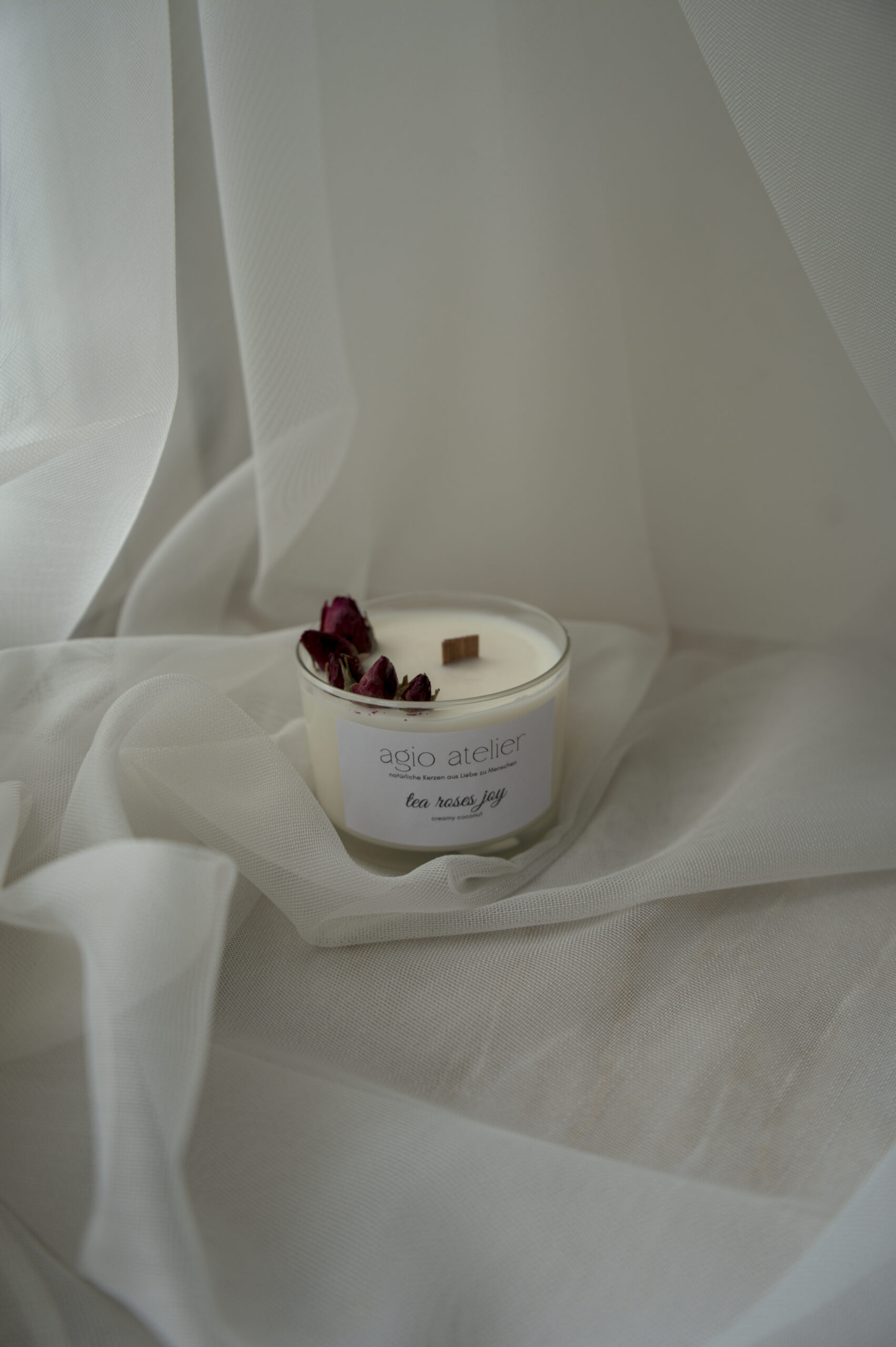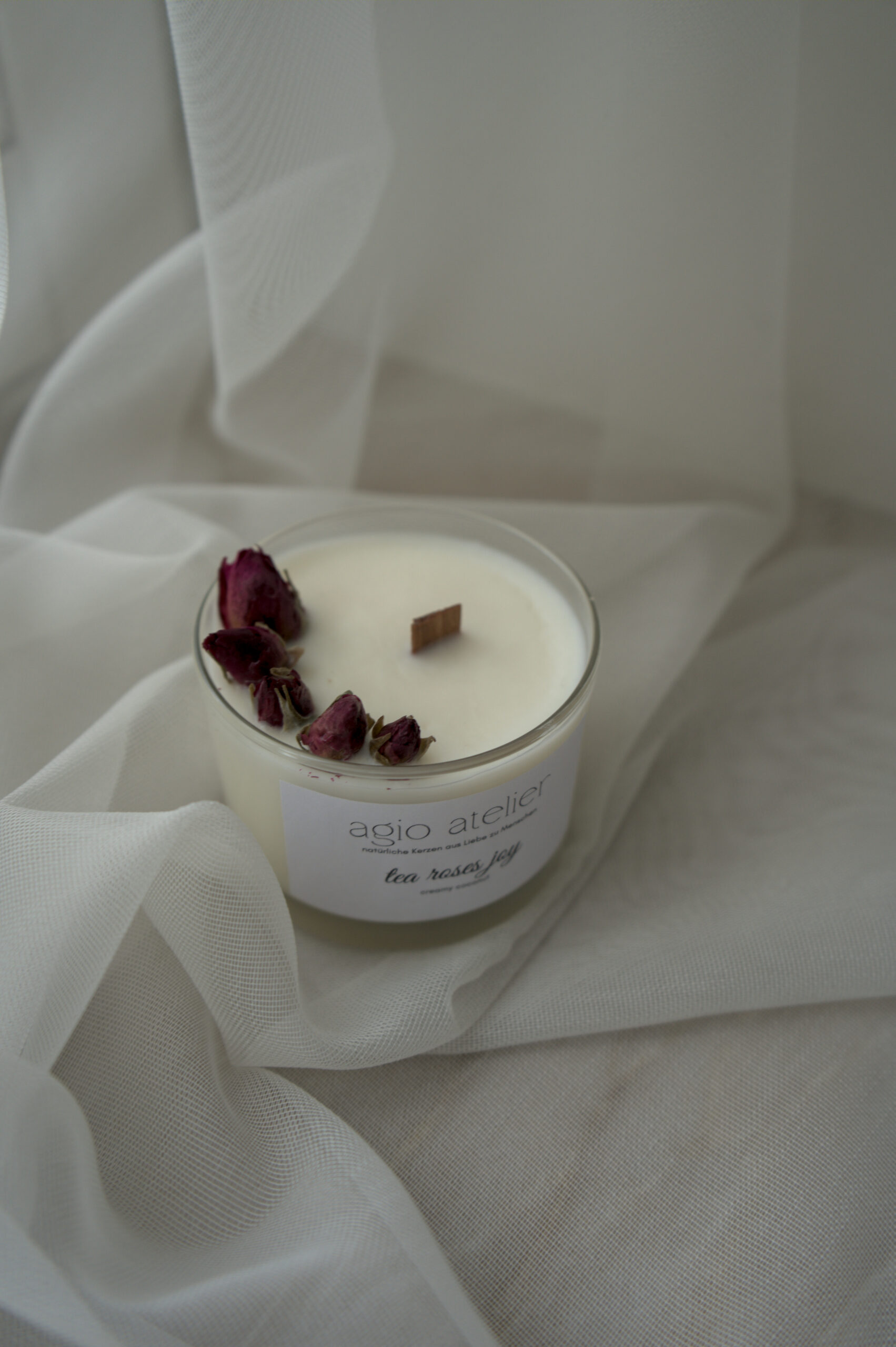 Kerze aus premialem Soja Wachs mit Holzdocht und Aromaöle Ihrer Wahl. Mit kleinen Teerosen als Deko.