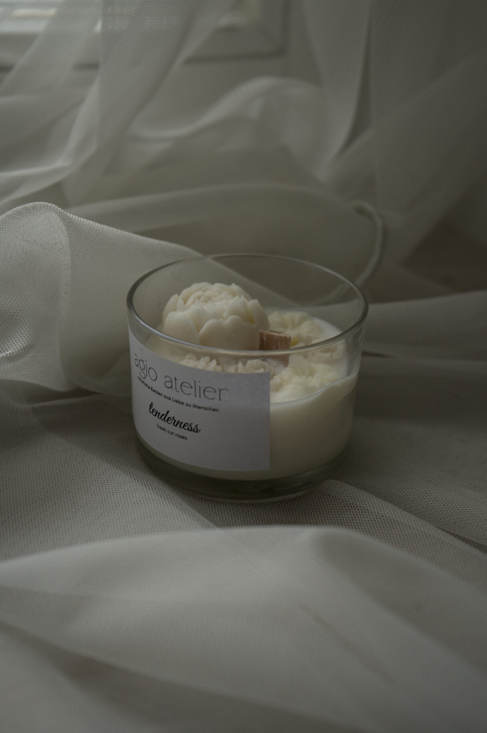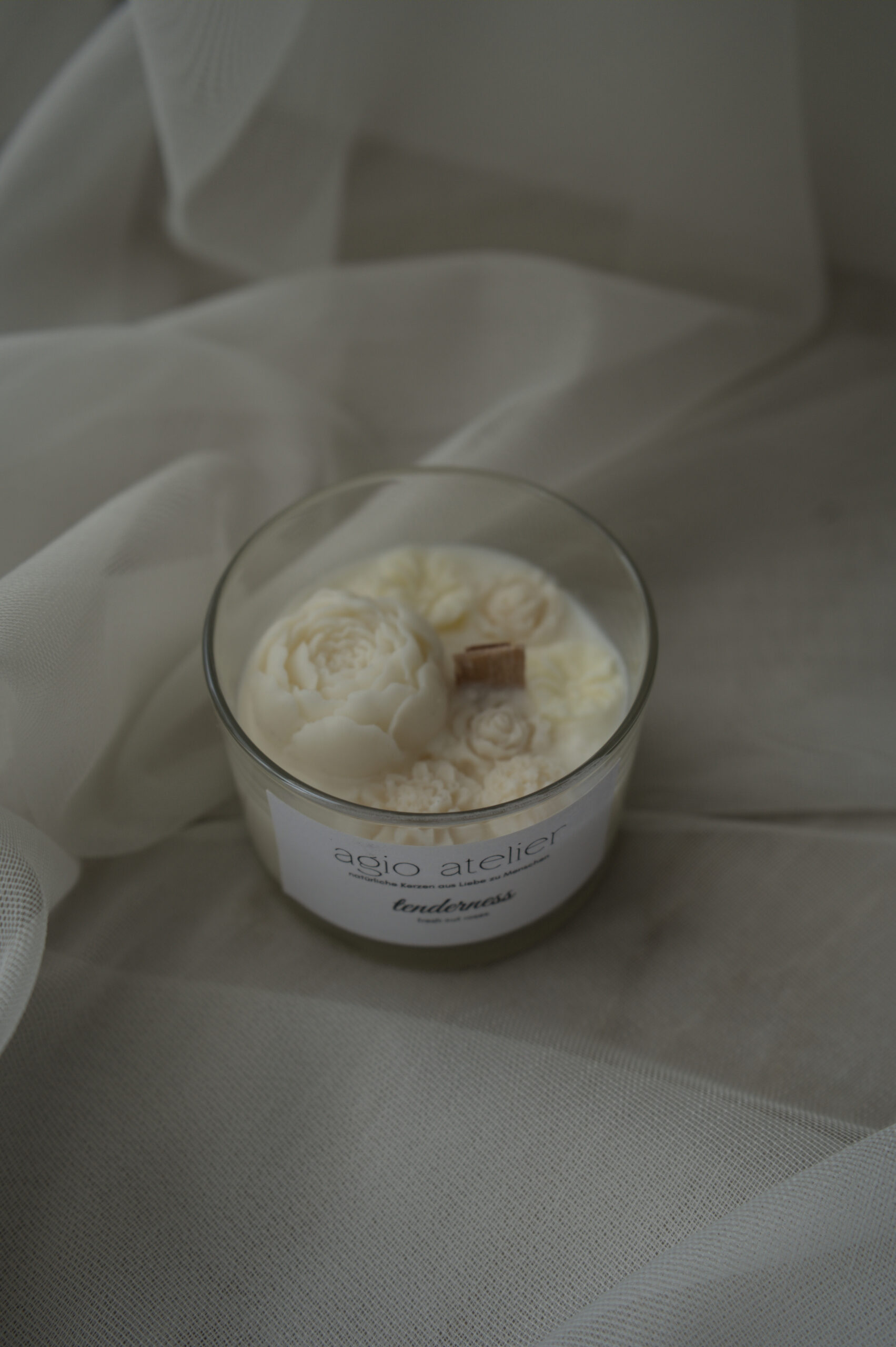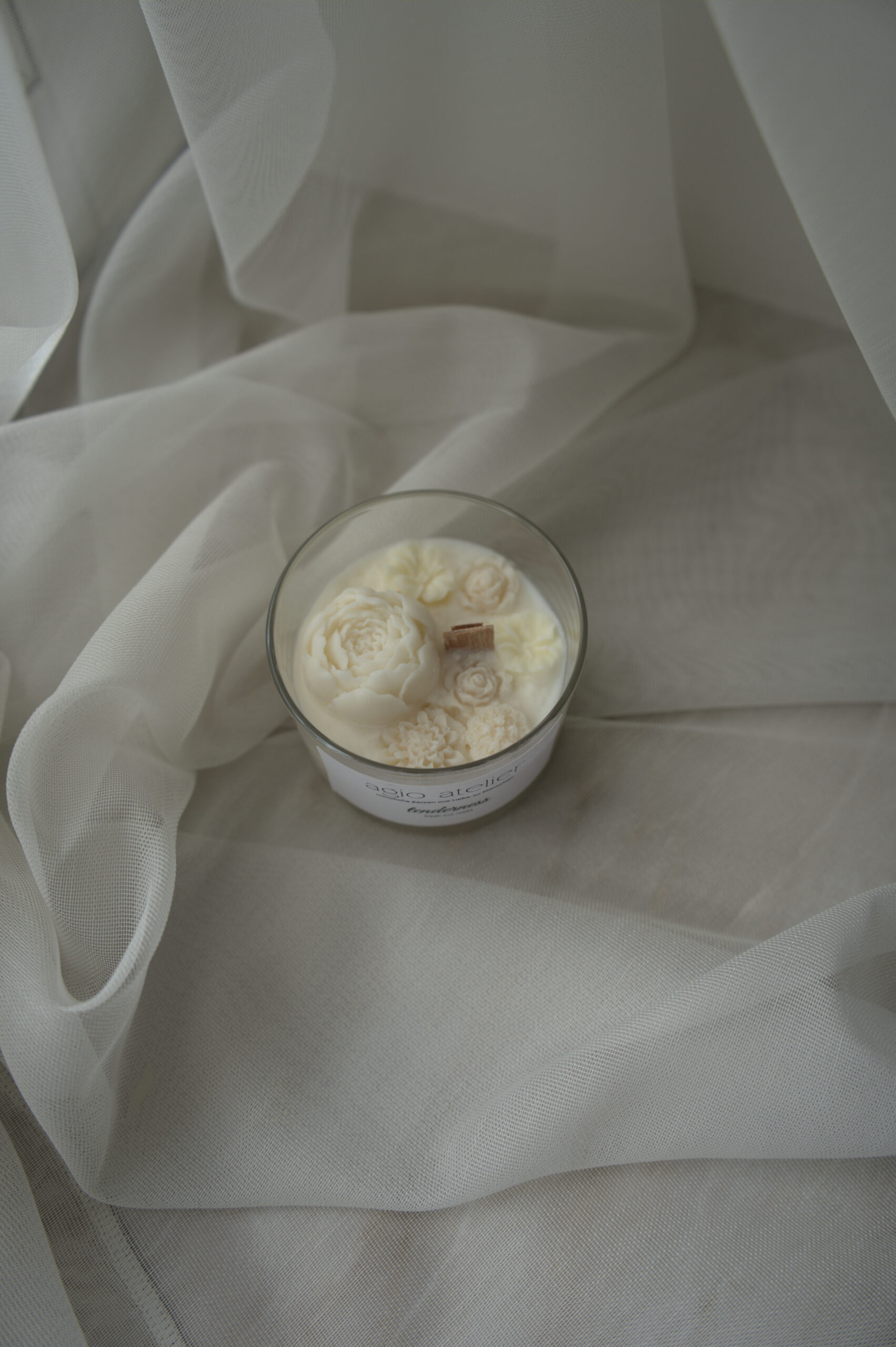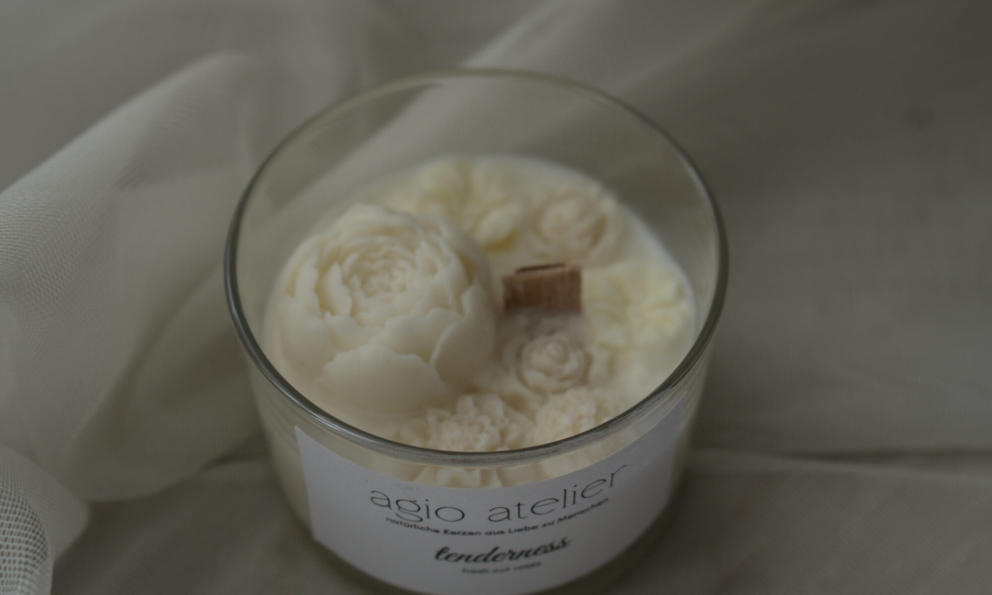 Eine Kerze aus premialem Soja Wachs mit Holzdocht und Aromaöle Ihrer Wahl. Mit Wachsblumen dekoriert.