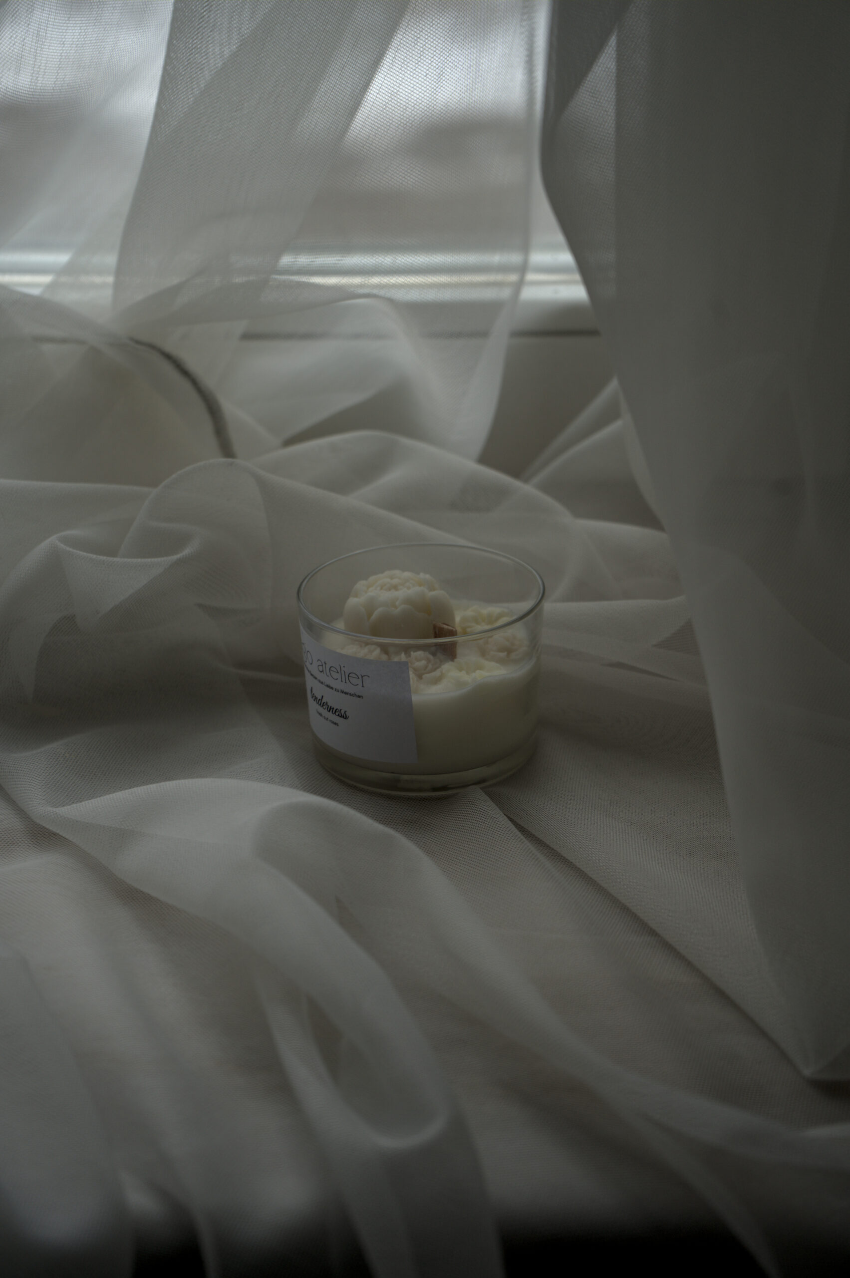 Handgegossene Kerze im Glas mit zartem Wachsblumen-Dekor.